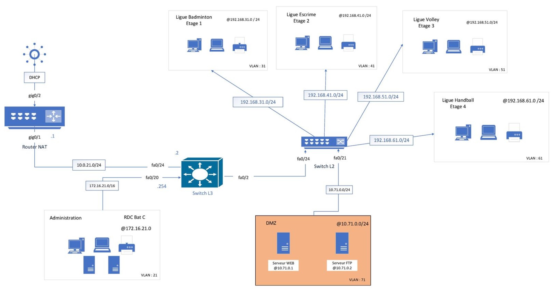 Suite à la mise en place des serveurs d'infrastructure, la Maison des Ligues nécessite désormais une architecture réseau robuste pour interconnecter ses différents services. L'enjeu est de gérer les flux de données entre les bureaux administratifs, les serveurs de la DMZ et les différentes ligues sportives (Badminton, Escrime, etc...) tout en garantissant une isolation stricte entre ces entités.